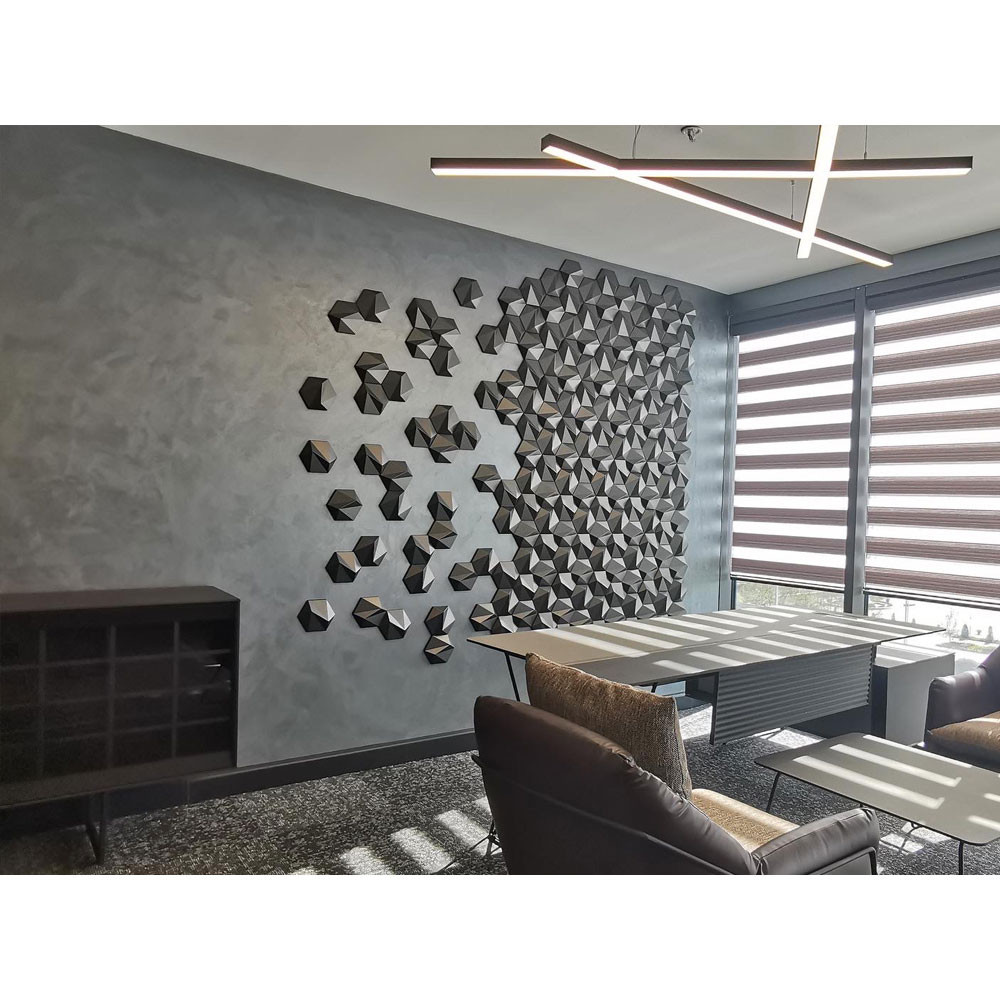 Mit dreidimensionalen sechseckigen Fliesen ist „Ruko Design“ eine elegante Version der Wabenstruktur, die in verschiedenen Farben, sowohl in glänzender als auch in matter Oberfläche, erhältlich ist. Seine abgewinkelten Flächen werden zu einer Symphonie aus Tönen und Lichtspielen und können zu eleganten Looks und Grafiken arrangiert werden. Mit der dekorativen Wandgestaltung von Ruko können Sie Wunder schaffen, die mit ihrer attraktiven polygonalen Geometrie, modernen und symmetrischen scharfen Linien ein realistisches dreidimensionales Erscheinungsbild erzeugt. 3D-Wandpaneel Ruko Ein Augenschmaus entsteht, wenn sich die Optik von schlichten Farbtönen und natürlichem Licht sanft auf den sechseckigen Wandpaneelen widerspiegelt.
